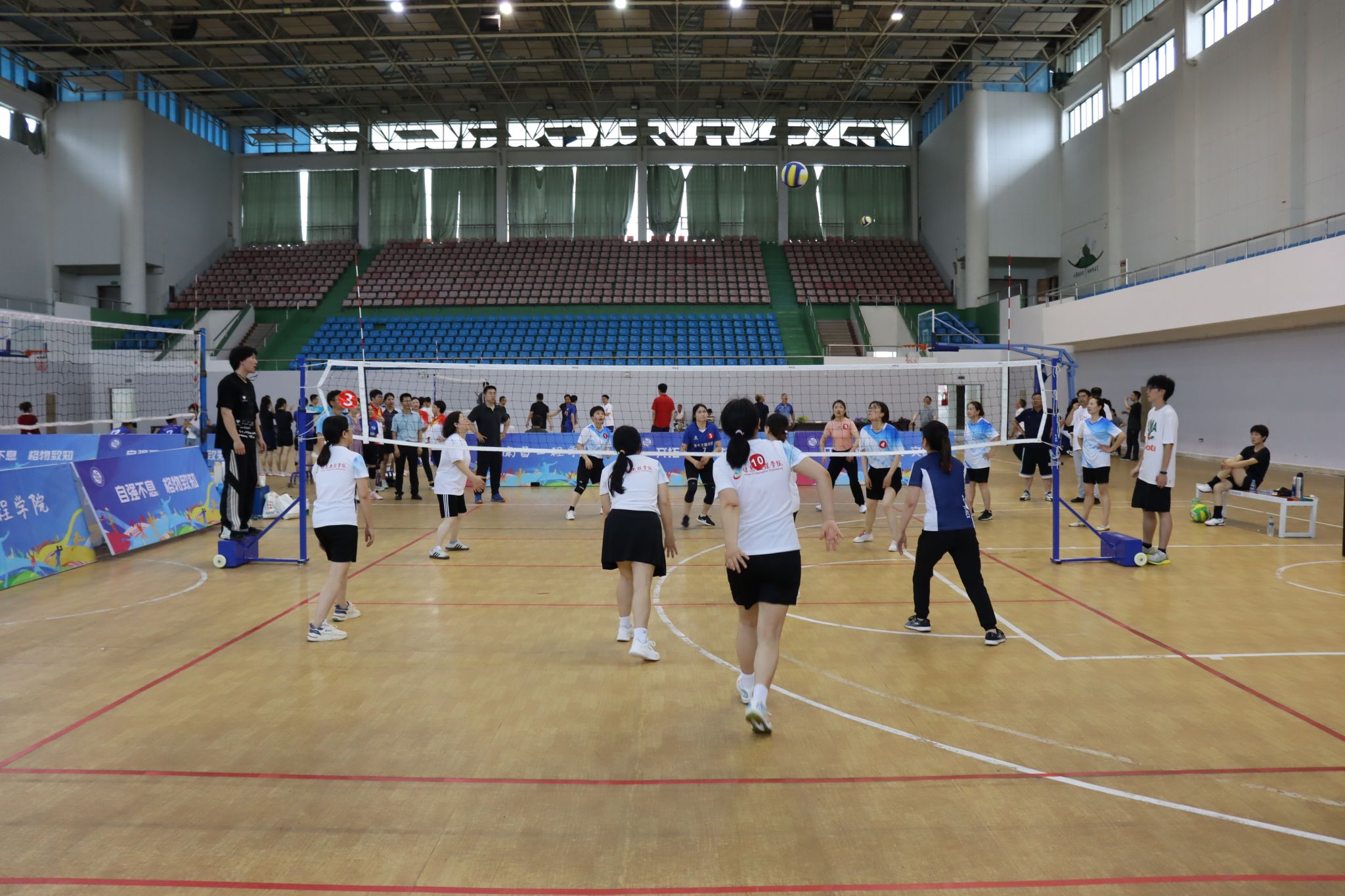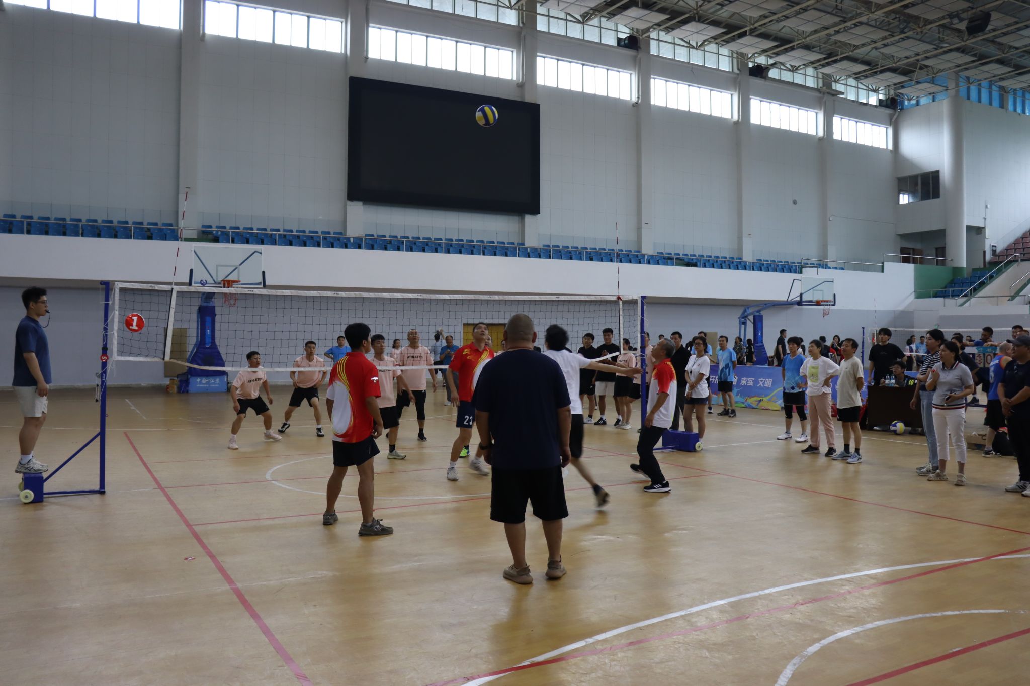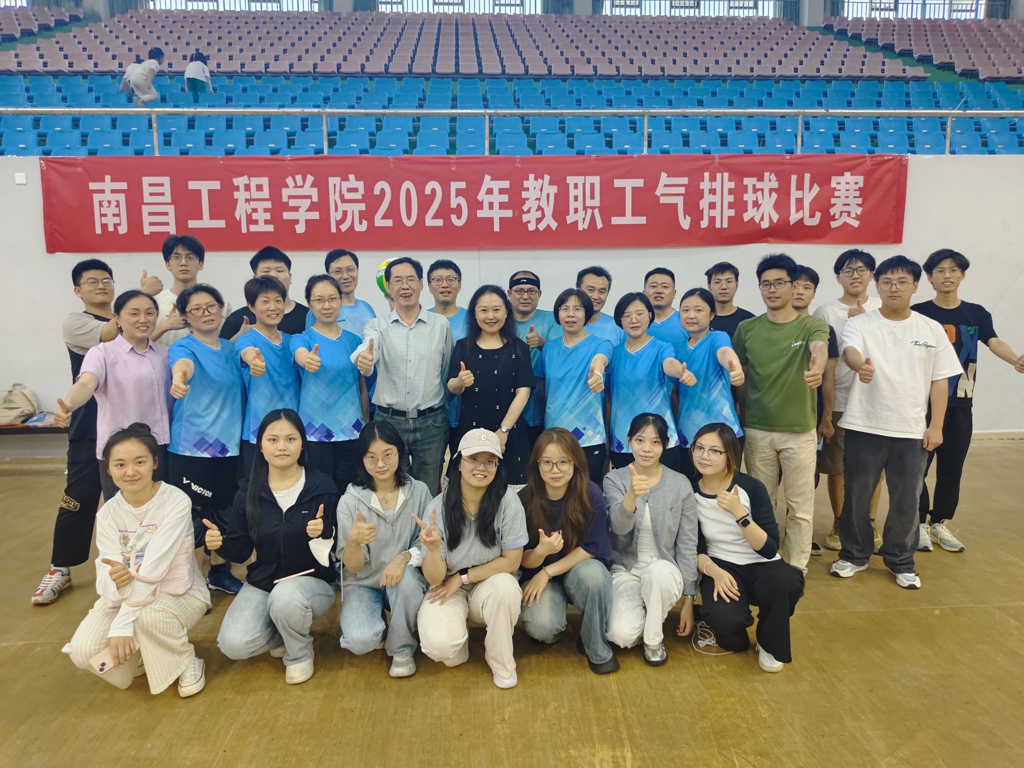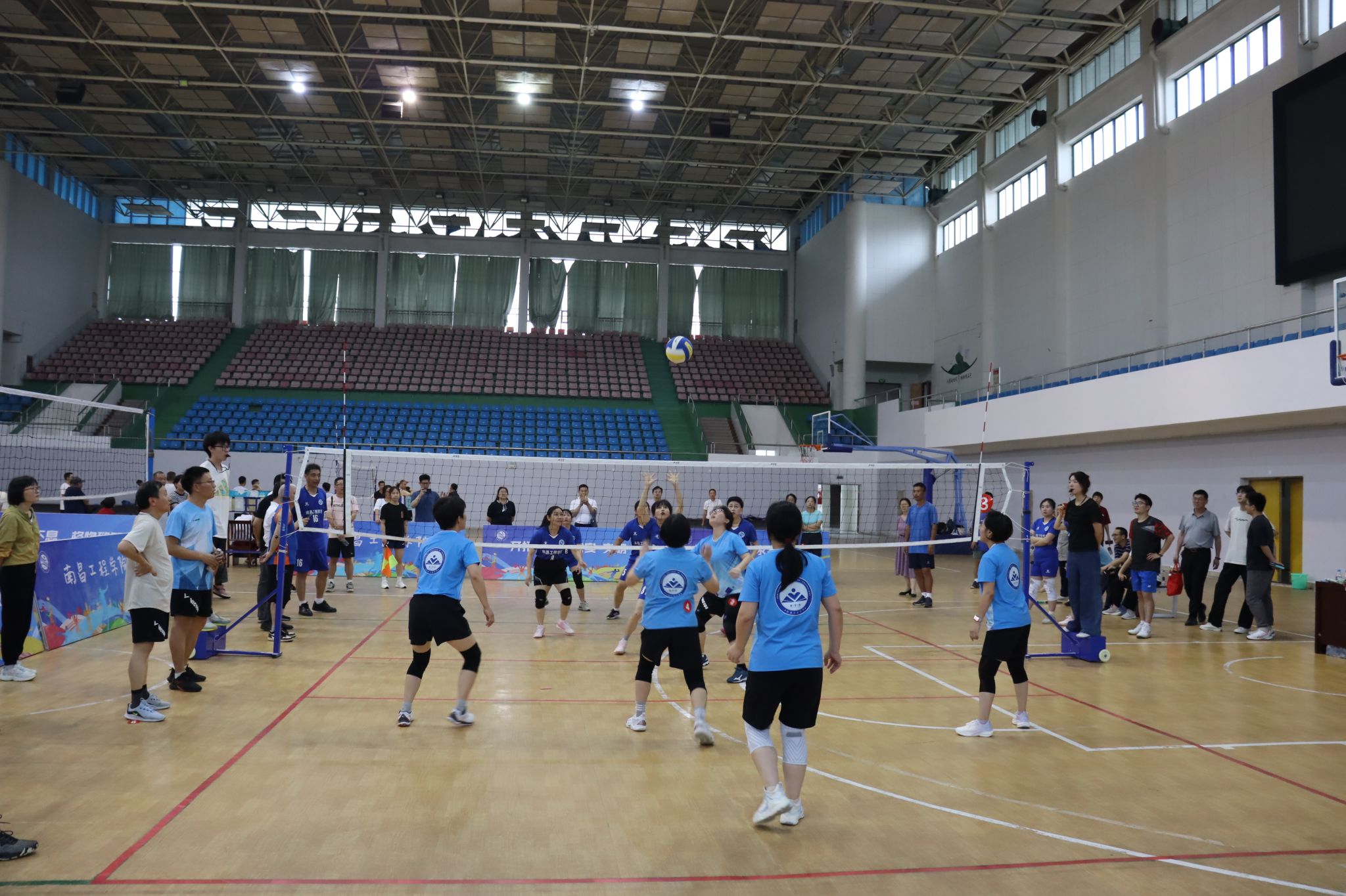 5月21日至27日,由校工会、体育教学部主办,教职工气排球协会承办的2025年度教职工气排球比赛在体育馆举行,来自17个基层工会和离退休队的33支男女教工队,近300余名教职工参赛。校党委副书记、校长刘祖文,副校长李培生,校党委委员、组织部部长欧阳子龙,校党委委员、宣传部部长洪恩强作为队员参赛。校党委副书记吴泽俊到现场指导比赛工作并看望参赛队员。