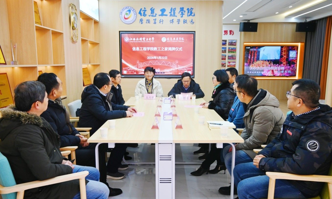 1月22日下午,信息工程学院在信工楼A202为“教工之家”举办了一场简约而隆重的揭牌仪式,校党委书记汪胜前、校党委副书记吴泽俊和副校长陆伟锋应邀出席,活动还特邀全国教书育人楷模支月英老师共同为信息工程学院“教工之家”揭牌。校工会主席胡盛华、全国优秀教师王颖教授、全省模范教师崔猛教授、各基层工会主席及委员、信息工程学院党政领导班子成员及教师代表50余人参加。仪式由信息工程学院院长赵嘉主持。